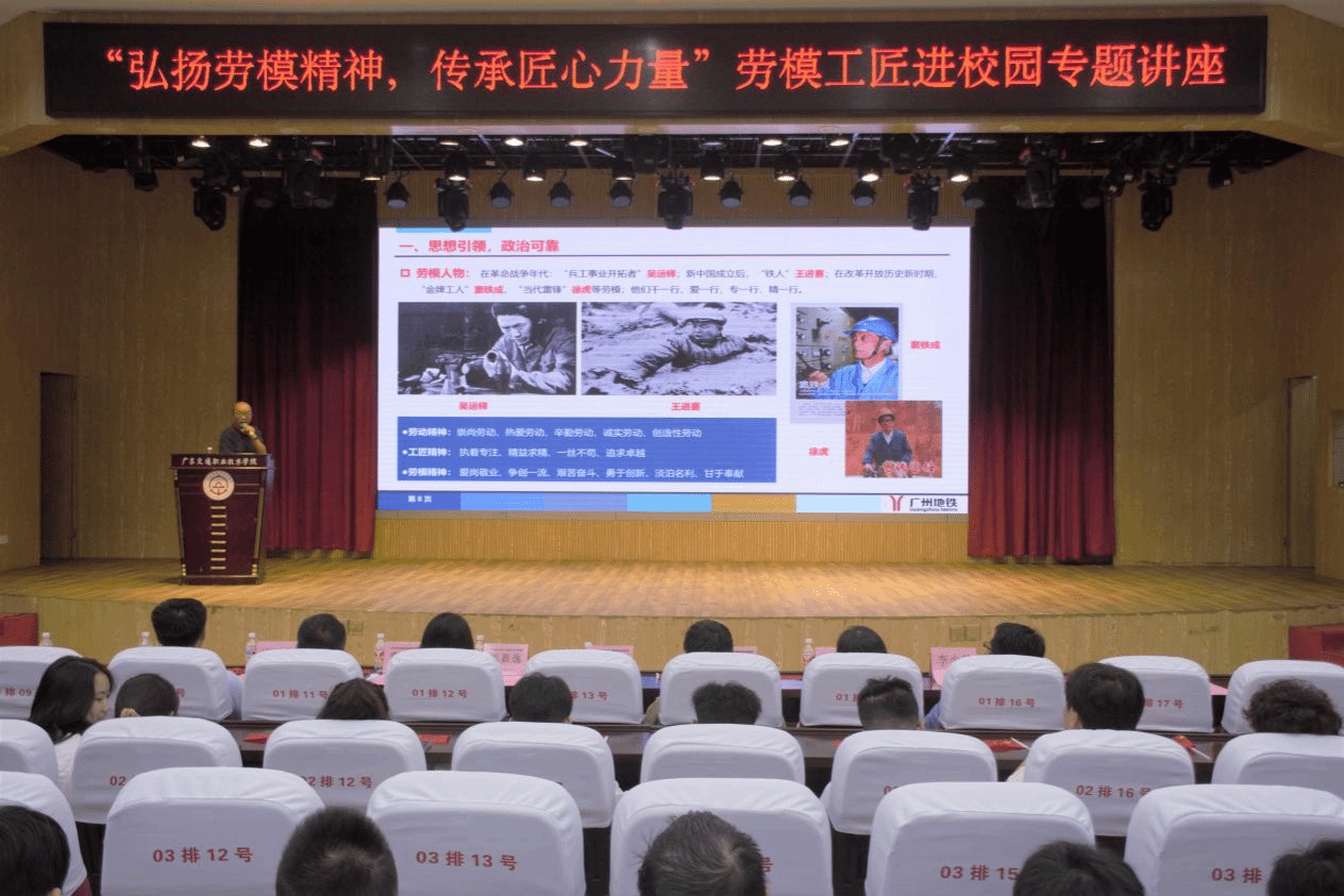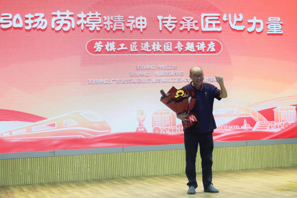 为落实立德树人根本任务,大力弘扬劳模精神、劳动精神、工匠精神,充分发挥劳模工匠的榜样引领作用,结合2025届毕业生系列教育活动,10月14日,学院成功举办“弘扬劳模精神,传承匠心力量”劳模工匠进校园专题讲座。活动由学院工会主办,轨道交通学院承办,广东省交通运输行业劳模和工匠人才创新工作室联盟支持。学院副院长、工会主席熊嘉逸,副院长王劲松,工会常务副主席秦胜利,轨道交通学院党委书记、分工会主席肖星,党委副书记李少伟,副院长宋以华,教师代表及2025届毕业生代表共600余人参加本次讲座。