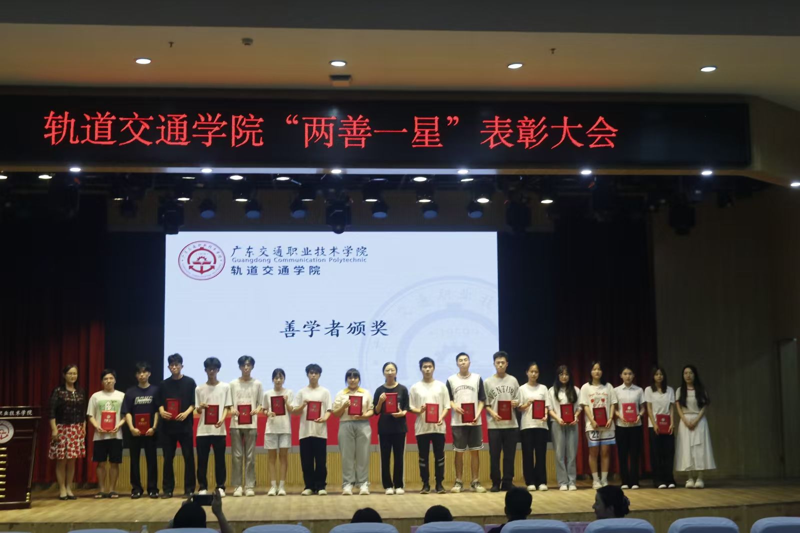 为深化“两善一星”教育实践、提升学风院风建设质量,进一步推动学院“学风建设月”活动的深入开展,10月21日下午,轨道交通学院在天河校区图书馆报告厅开展以“深化‘两善一星’教育实践,共筑优良学风院风”为主题的“两善一星”表彰大会。轨道交通学院党委书记肖星、综合办公室主任陈小稚、教务员、辅导员、2023级和2024级各班班委,“两善一星”获奖人员及学生代表300余人参加会议。