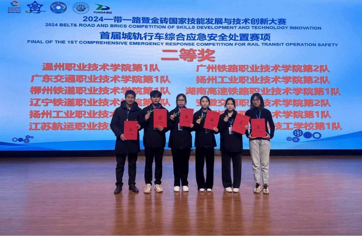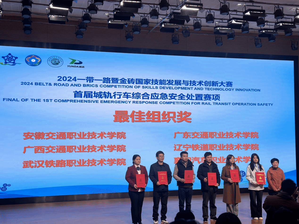 12月8日,2024一带一路暨金砖国家技能发展与技术创新大赛之“首届城轨行车综合应急安全处置赛项”比赛在武汉铁路职业技术学院落下帷幕。经过激烈的角逐,我院轨道交通学院宋以华、夏宇两位老师指导的林佳璇、谢崇哲、林欣、李琪曼团队和彭湘涛、丛丛两位老师指导的赖思如、吴振智、杨康怡、杨怡团队,分别获得一金(一等奖)一银(二等奖),广东交通职业技术学院获“最佳组织奖”。