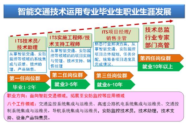 各位请这边走,我们来看看我们专业读出来后毕业生究竟能干啥呢?毕业1-2年,在监控系统、收费系统、道路交通控制、GPS导航与监控等智能交通领域,拓展至安防监控、地铁等其他应用领域,从事相关系统集成运维技术员、技术助理等岗位;毕业3-5年,在智能交通、安防监控、地铁领域,从事系统实施工程师、技术支持工程师岗位;毕业6以上,还有可能成为项目经理,乃至行业专家啊,哈哈,是不是很诱人啊!