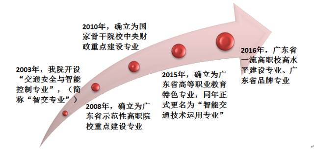 请大家跟我来,首先看看我们专业的成长历程,从2003年呱呱落地,到2016年确立为广东省一流高职校高水平建设专业、广东省品牌专业,我们专业已经成长为一位风度翩翩的少年,正在蓬勃发展,开启新的篇章。