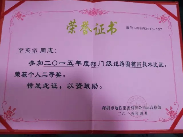 正是这种认真做事业的精神和扎实的知识储备,让李英宗荣获2015年“全国列车先锋”,整个深圳市地铁集团运营总部一万多员工仅有3人获得这个奖。“全国列车先锋”奖项对于地铁人是意义非凡的。