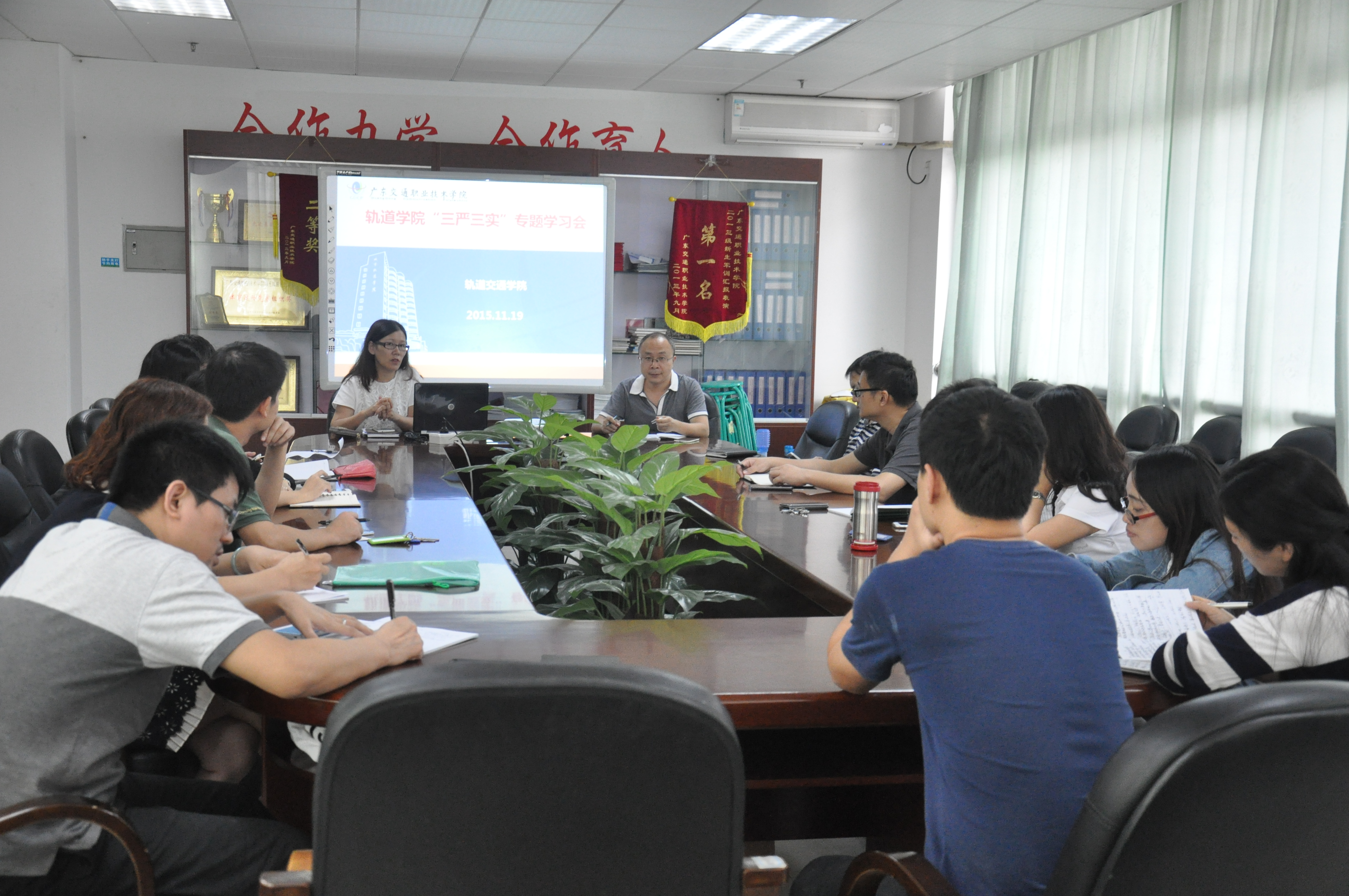 11月19日,轨道交通学院召开“三严三实”专题教育学习会,主要就严守党的纪律、党的规矩,认真贯彻学习《中国共产党廉洁自律准则》和《中国共产党纪律处分条例》,执行“八项规定”精神等内容开展学习。党总支书记吴璇华主持会议,轨道学院全体老师参加会议。