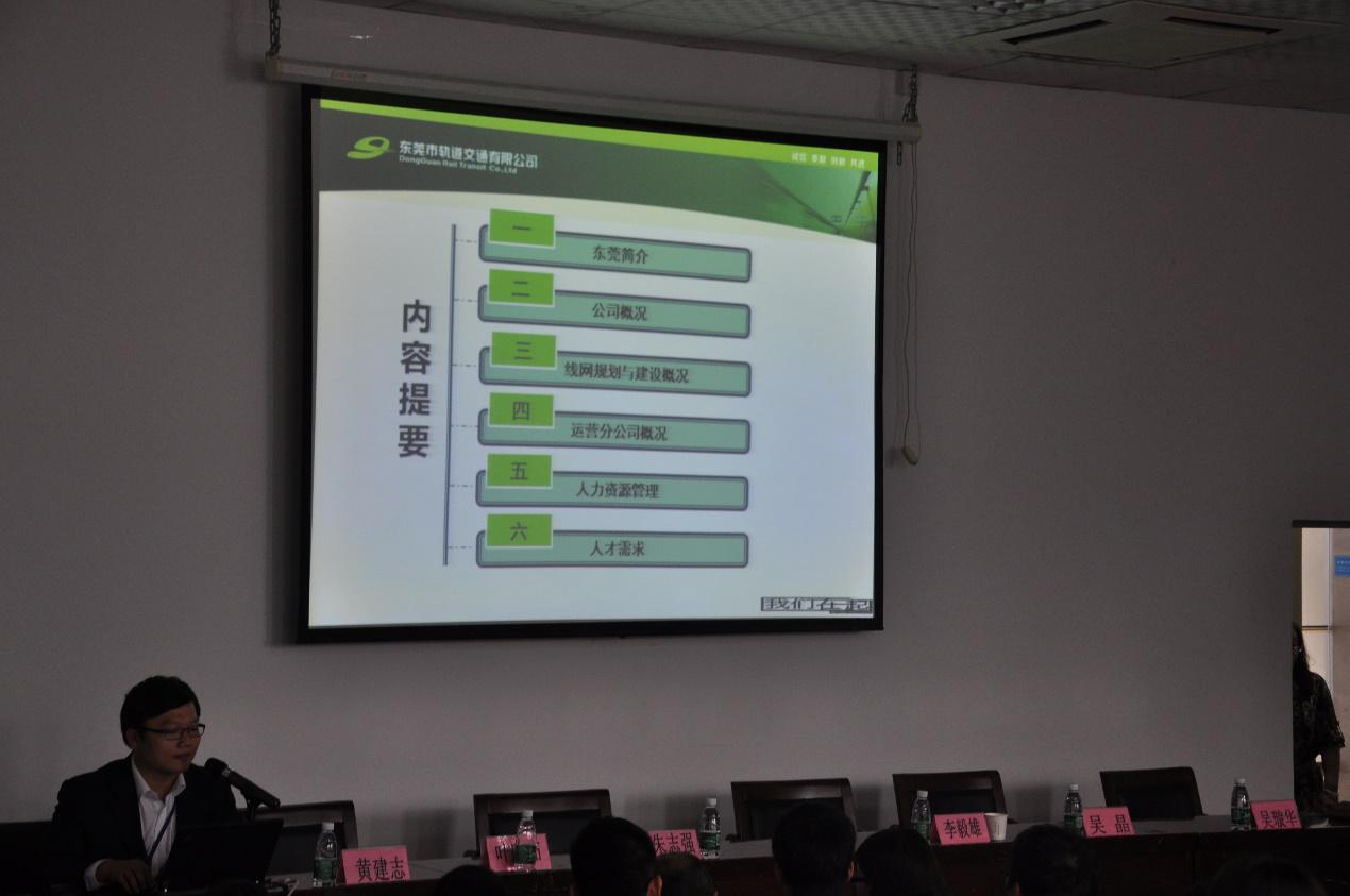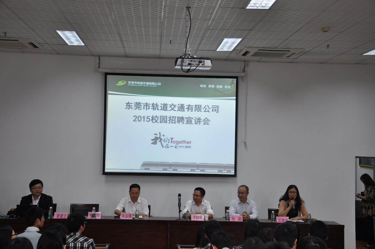 2014年11月26日,东莞市轨道交通有限公司来我校进行招聘宣讲。这是东莞市轨道交通有限公司首条线路即将开通之际招聘工作的第一站,也是第一次来我院招聘2015届毕业生。宣讲会于上午9:30在我校土木学院学术报告厅举行,出席本次宣讲活动的嘉宾有:东莞市轨道交通有限公司人力资源部部长李毅雄、运营分公司维修工程部经理朱志强、人力资源部招聘黄建志、李靖宇、叶欣茹,以及轨道交通学院院长吴晶、党总支书记吴璇华等150多名师生。