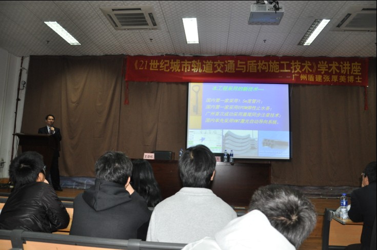 应城市轨道交通学院的邀请,学院客座教授、广州市盾建地下工程有限公司总工程师、教授级高工张厚美博士(后)2012年11月27日下午,来校开展了《21世纪城市轨道交通与盾构施工技术》学术讲座。城市轨道学院王劲松院长、蒋英礼、卓木波等多位专业老师、轨道学院2011级、2012级学生以及广州盾建公司办公室胡莉莉主任、人力部张城玲经理等参加了本次讲座。