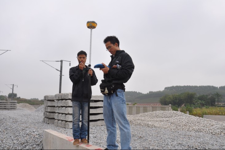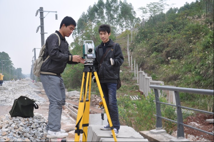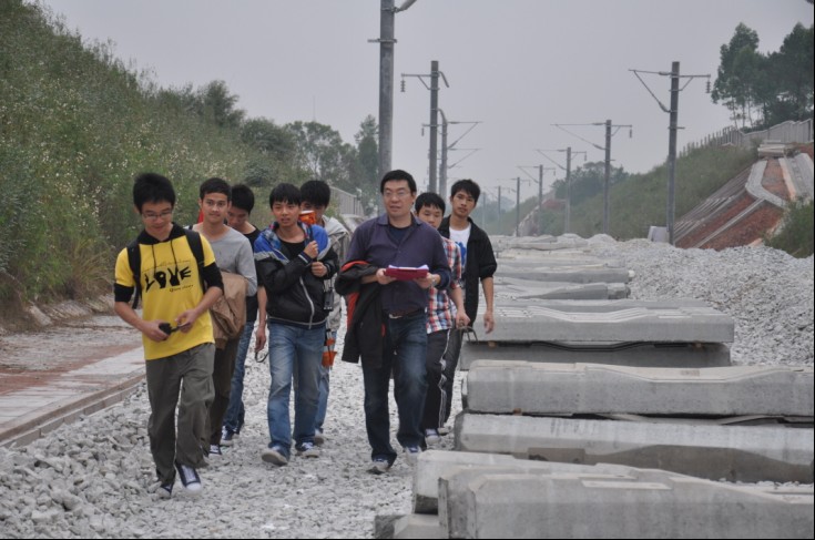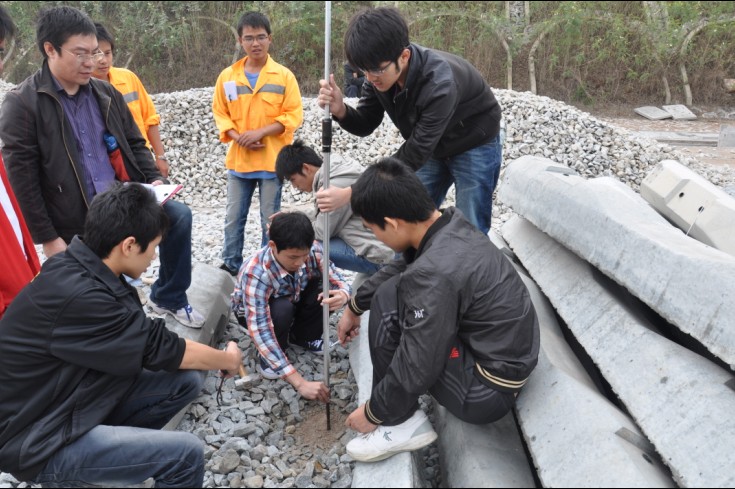此次“工地课堂”教学活动,我院师生承接了40km的高铁线路施工测设任务。主要是为道砟捣固、轨枕、道岔、500米无缝长钢轨铺设进行中桩的测设以及提供桩顶高程。高铁测量精度要求高、工序紧凑、工期短、步行路途长(有道砟不能行车),期间恰逢降温、下雨,工作环境十分艰苦,但能在高铁一线实际工程中学习,有学院老师和企业工程师的共同指导,同学们感到在“工地课堂”学到的知识多,机会难得,因此学习和工作的热情很高,进步很快。