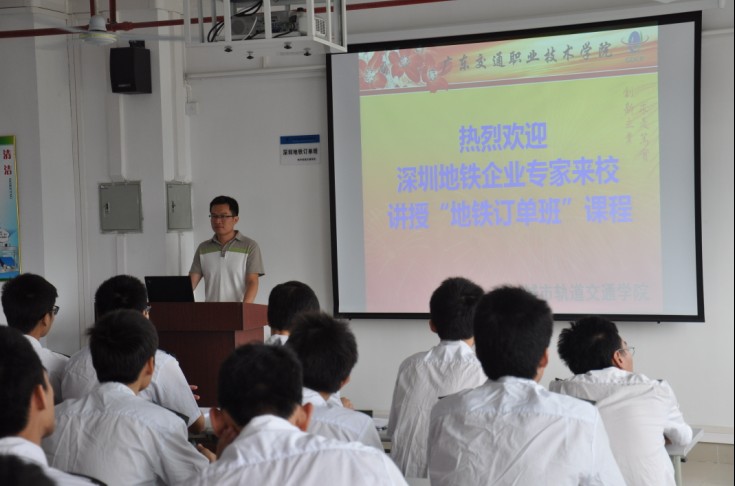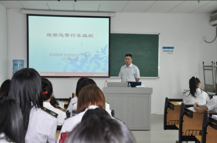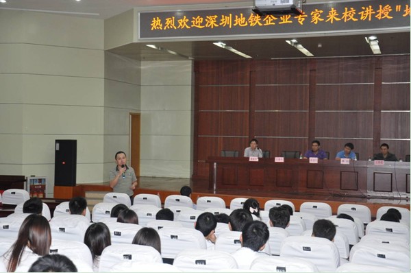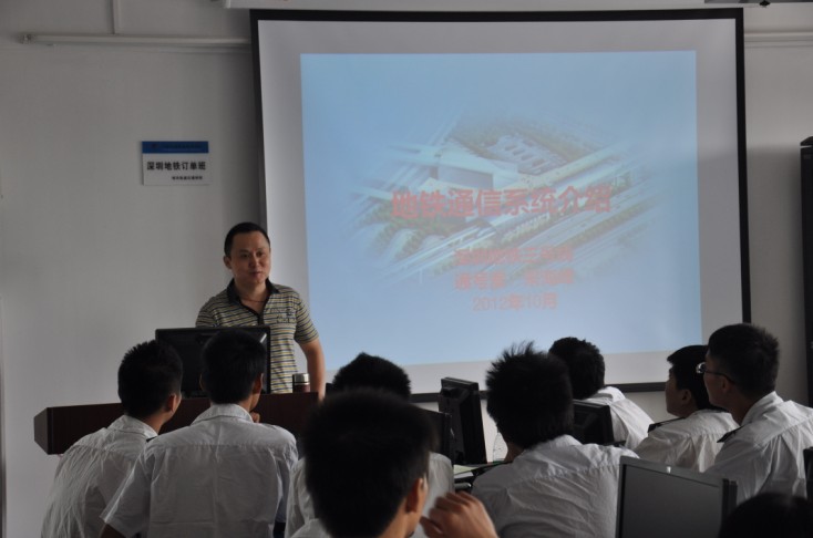 在2013届深圳地铁、广州地铁订单班课程接近中期之际,按照课程计划安排,2012年10月16日、17日,深圳地铁派出6位一线专家来校授课,并就双方校企合作议题进行深入交流。一行由运营分公司培训部部长张进生带队,成员有人事部经理林辰、车务部副部长罗海彬、通号室经理宋海峰、文滨工程师、基建室副经理李冕梧。