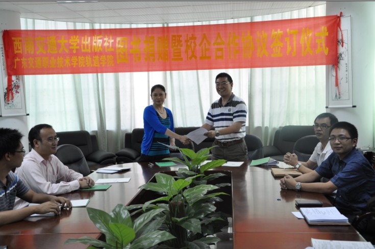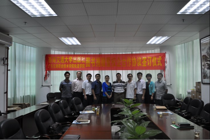 2012年10月22日下午,在广东交通职业技术学院城市轨道交通学院会议室,举行了西南交通大学出版社与轨道学院赠书协议签订仪式。出席仪式的有西南交通大学出版社副社长胡玲,发行部主任胡军,广州市道锋图书发行公司总经理何颂锋,西南交通大学出版社策划副总监李晓辉,编辑姜锡伟,轨道学院院长王劲松,总支书记吴璇华,副院长黎新华以及部分教师代表。