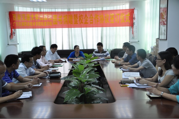 赠书协议签订仪式后,双方就校企合作方面进行了会谈。教师代表对西南交通大学出版社出版的教材提出了一些建设性建议;并就下一步如何开展校企合作,编写珠三角地区轨道交通类系列职教教材进行了讨论。双方表示,今后将更加密切合作,开发和提供优质教材,为社会培养轨道交通技术人才服务。