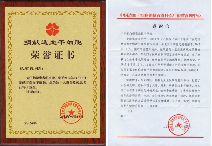 张顺良同学矮小的个子,黝黑的皮肤,朴素而平凡。然而就是这位普通同学,却是社会的爱心使者。 2011年5月,他参加了学校组织无偿献血,并参与中国红十字会“自愿捐献造血干细胞公益项目”,光荣地成为一名造血干细胞志愿捐献者。2011年10月,接中华骨髓库通知,张顺良同学与一名血液病患者的移植基因完全相合。张顺良得知情况后,在他生命遇到了十几万分之一的选择时,张顺良同学以一颗平常心,从容担当,在征得父母支持之后,义无反顾地履行了捐献承诺。于2012年3月15、16日在广州南方医院先后两次采集,无偿捐献自己的造血干细胞。这无私奉献的善举,挽救了他人的生命,他用自己的实际行动来诠释一名当代大学生乐于奉献的雷锋精神。
