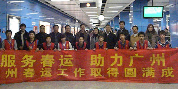 从2012年1月8日开始,该院地铁春运志愿服务队以“服务春运,助力广州”为口号,85名志愿者奋战在地铁新港东、昌岗、火车站这三个候乘站点,负责引导旅客上车、指引转乘方向、协助旅客行李搬运、车厢文明倡导等工作。半个月的志愿服务期间,志愿者们每天晚上8点上岗,一直工作到凌晨2点,距地面数十米深的车站办公室是他们的休息室,水泥地板、办公桌椅是他们的床铺,服务队员们以最大的毅力克服了休息时间不足、睡眠环境不好,以及天气寒冷、就餐不便等困难,始终保持高昂的斗志、积极的心态、良好的精神面貌,以优异的表现获得地铁各级领导的高度评价,《羊城晚报》记者也对该院地铁春运志愿服务队进行了专题采访。