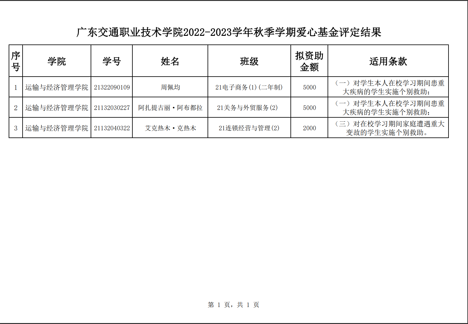 根据《广东交通职业技术学院爱心基金管理办法(试行)》,经学生个人申请、二级学院审查、学生工作处审核,学生工作委员会审批,我院拟推荐周佩均等3名同学获得2022-2023学年秋季学期学生爱心基金,现予公示(具体名单见附件)。公示期自2022年12月19日至12月24日(公示5个工作日),任何人如有异议,在公示期间可以以书面形式向学生工作处反映。反映情况时需自报或签署真实姓名,要有具体事实;不报或不签署真实姓名的,以及不提供具体事实材料的,一律不予受理。 受理部门:学生工作处