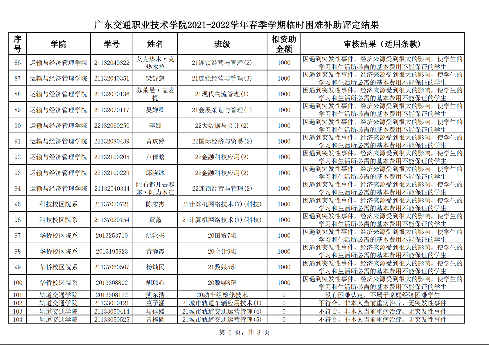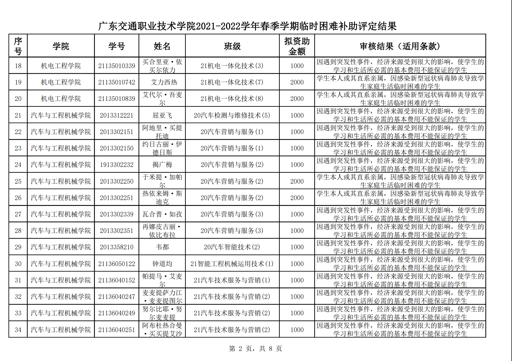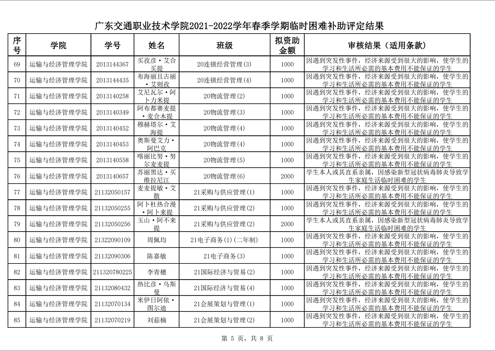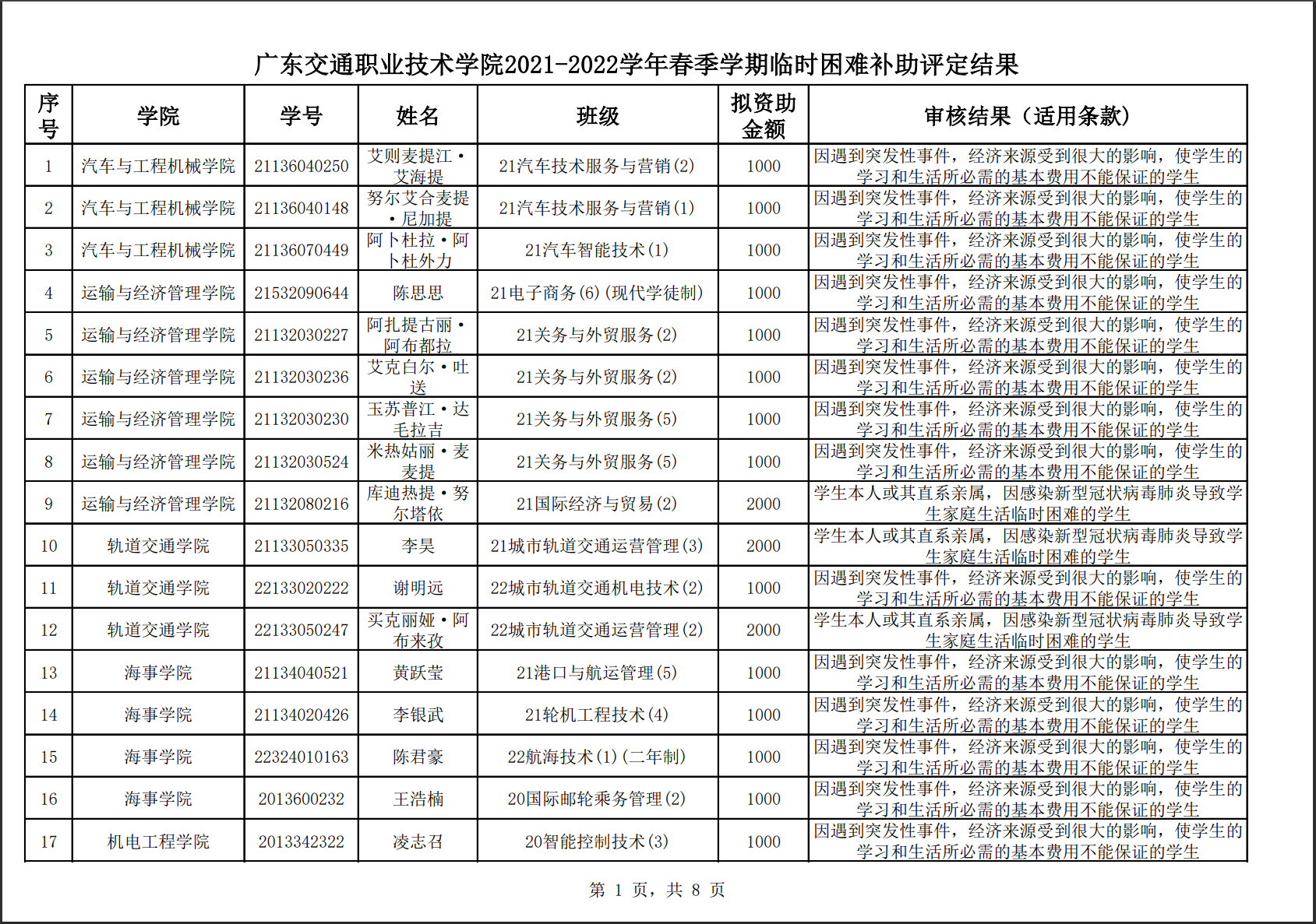 根据《广东交通职业技术学院学生资助工作实施办法》、《广东交通职业技术学院家庭经济困难学生资助管理规定》,经学生个人申请、二级学院审查、学生工作处审核,学生工作委员会审批,我院拟推荐艾则麦提江·艾海提等100名同学获得2022-2023学年秋季学期学生临时困难补助,现予公示(具体名单见附件)。