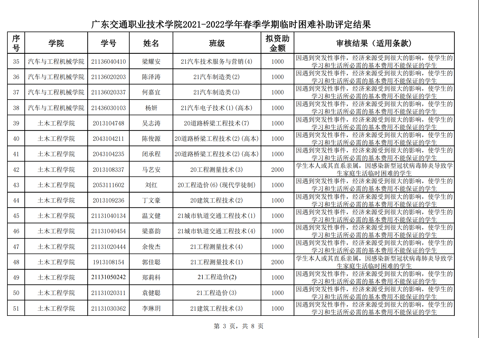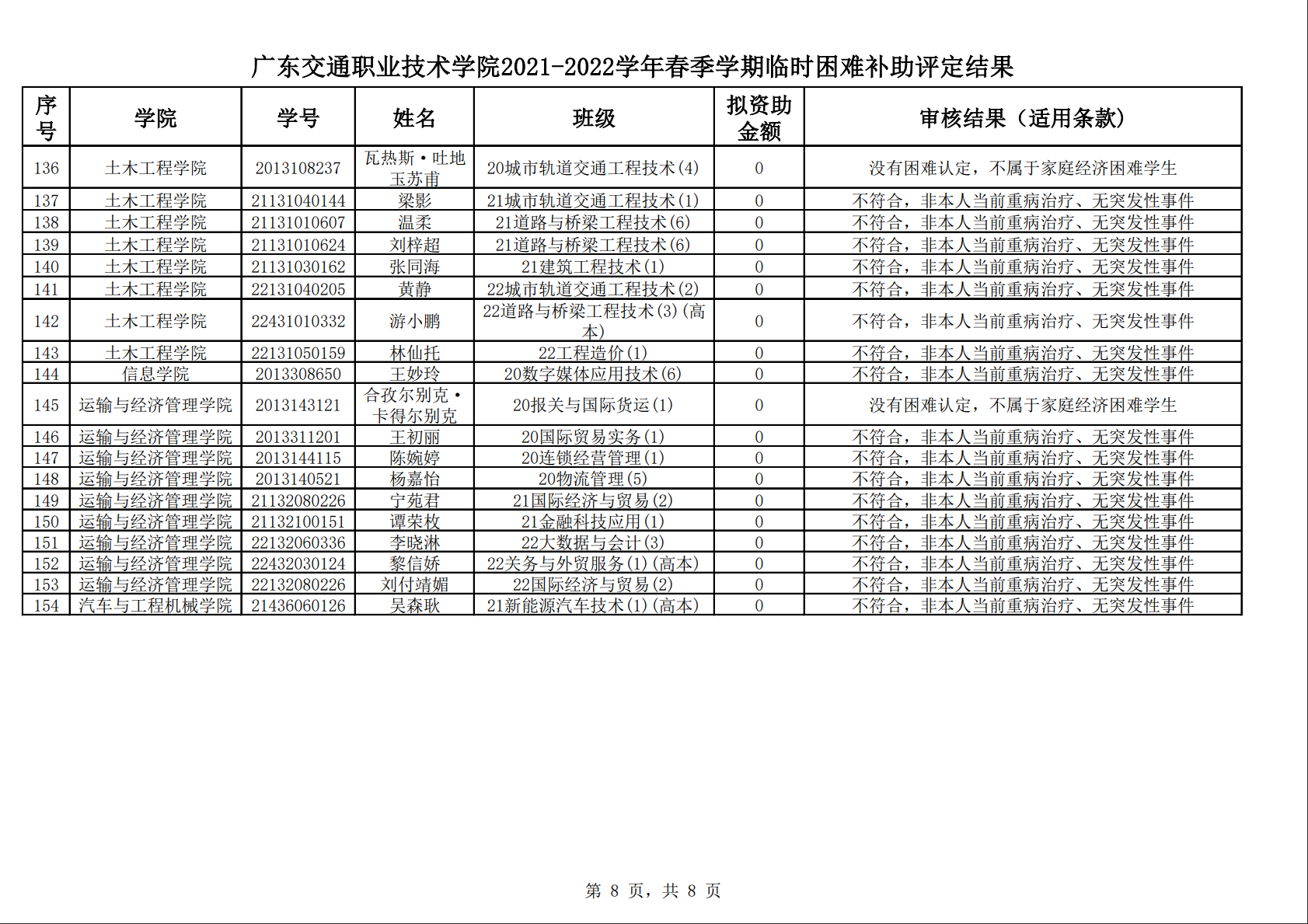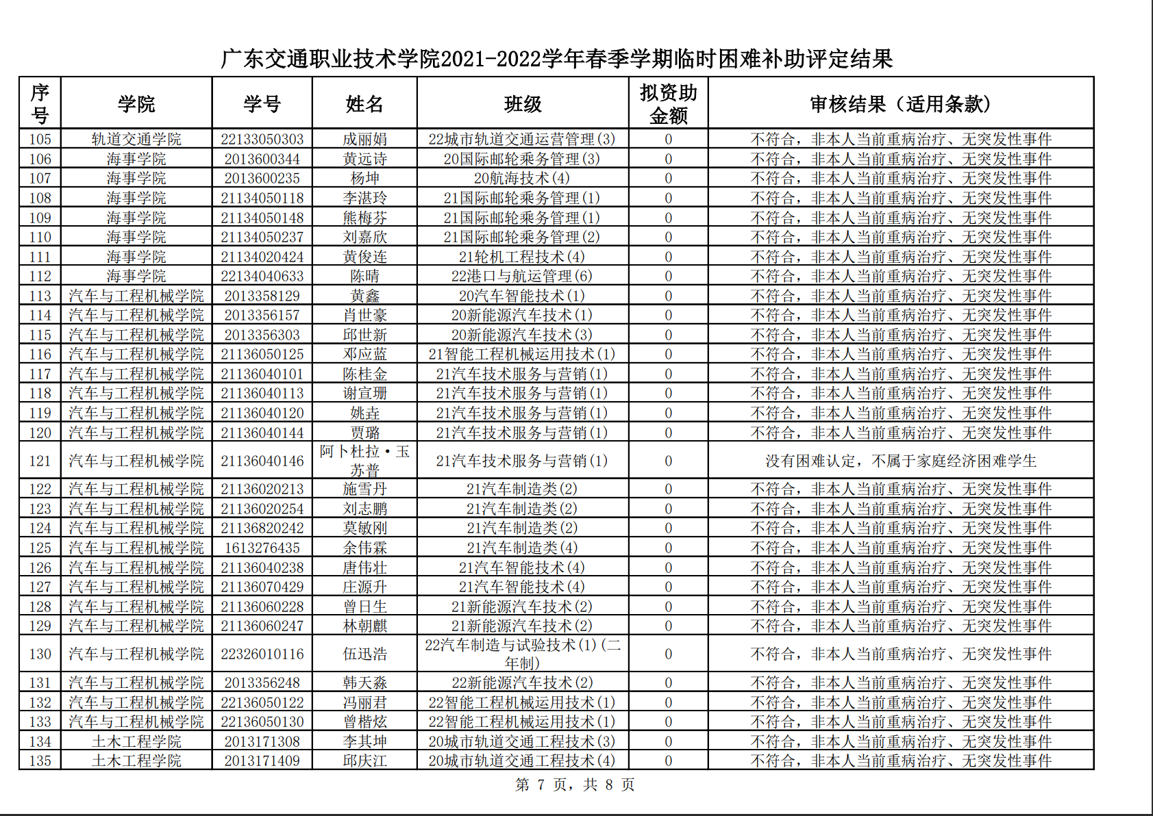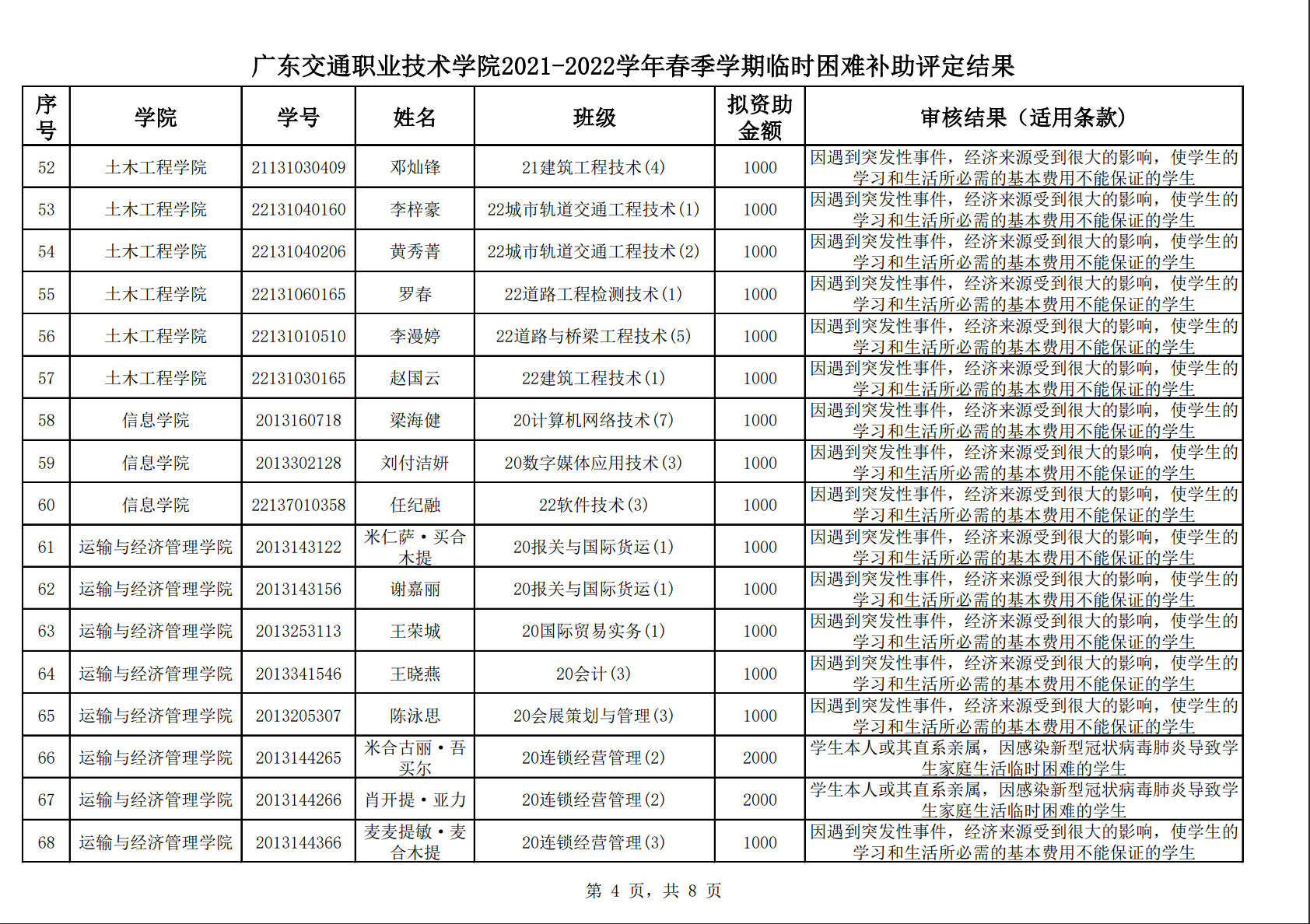 根据《广东交通职业技术学院学生资助工作实施办法》、《广东交通职业技术学院家庭经济困难学生资助管理规定》,经学生个人申请、二级学院审查、学生工作处审核,学生工作委员会审批,我院拟推荐艾则麦提江·艾海提等100名同学获得2022-2023学年秋季学期学生临时困难补助,现予公示(具体名单见附件)。