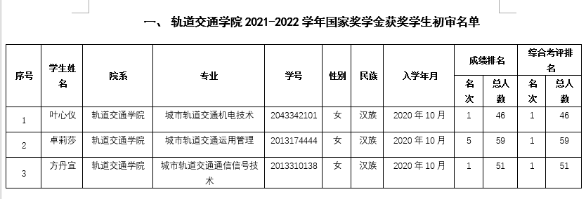 根据学校2022年国家奖助学金评审工作的安排,轨道交通学院评审小组严格按照《广东交通职业技术学院国家奖助学金管理办法》组织符合条件的学生自愿申请,并对申请材料进行初审。现将拟获2021-2022学年国家奖学金、国家励志奖学金初审名单公布如下表。