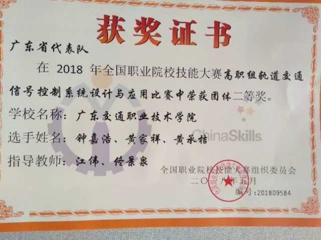 5月27日,全国职业院校技能大赛高职组“智联友道杯”轨道交通信号控制系统设计与应用赛项在吉林省吉林市隆重举行。广东省共有4所院校派队参加。我院代表队由轨道交通学院16级学生钟嘉浩、黄家祥、黄承桔,指导教师江伟、佟景泉,领队黎新华组成。经过3个小时的激烈拼搏,我院代表队发挥出色,获得该赛项全国二等奖。