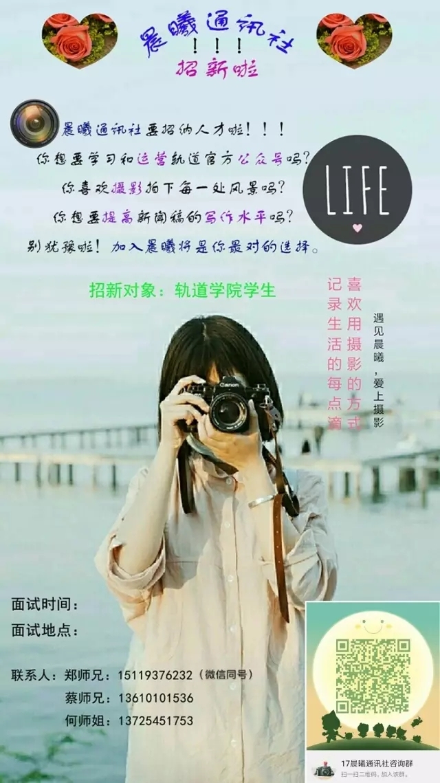 晨曦通讯社以《轨道微视界》为平台,以“报道校园,引领青年”为宗旨,通过报道校园要闻,追踪校园热点,撰写校园评论,策划校园深度报道,培养和提高社员的新闻敏感度,进而更好地宣传校园文化。