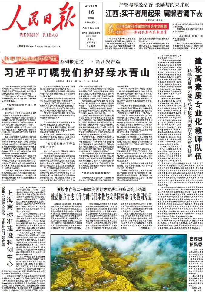 人民日报开设重要专栏“新思想从实践中产生”,今天刊发浙江安吉篇《习近平叮嘱我们护好绿水青山》。