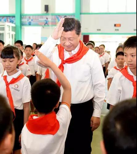 2014年“六一”前夕,习近平来到学校,同大家一起高唱《中国少年先锋队队歌》,给新少先队员戴上红领巾,还敬队礼祝贺。