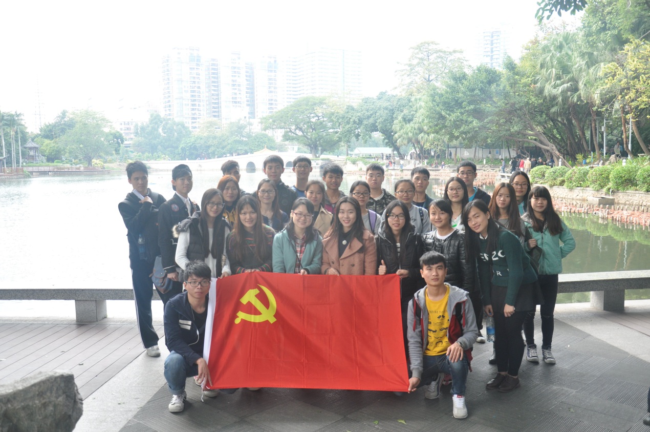 在颜老师和党小组成员的组织带领下,我们重访团一大广场,感受先烈革命爱国情怀。我们漫游荔湾湖公园,见证人民生活改善的例证。重访团一大,沿着前人遗迹,看周围点滴,忽地一阵秋风吹过,吹起历史回忆。我们在纪念,我们在缅怀,我们在肯定他们曾经付出的努力。斜阳之下,我们庄严的在革命先烈面前宣誓:我志愿加入中国共产党,拥护党的纲领,遵守党的章程,履行党员义务,执行党的决定,严守党的纪律,保守党的秘密,对党忠诚,积极工作,为共产主义奋斗终身,随时准备为党和人民牺牲一切,永不叛党。那一刻我们心中自豪澎拜,肩上的责任也突然的重大起来了……